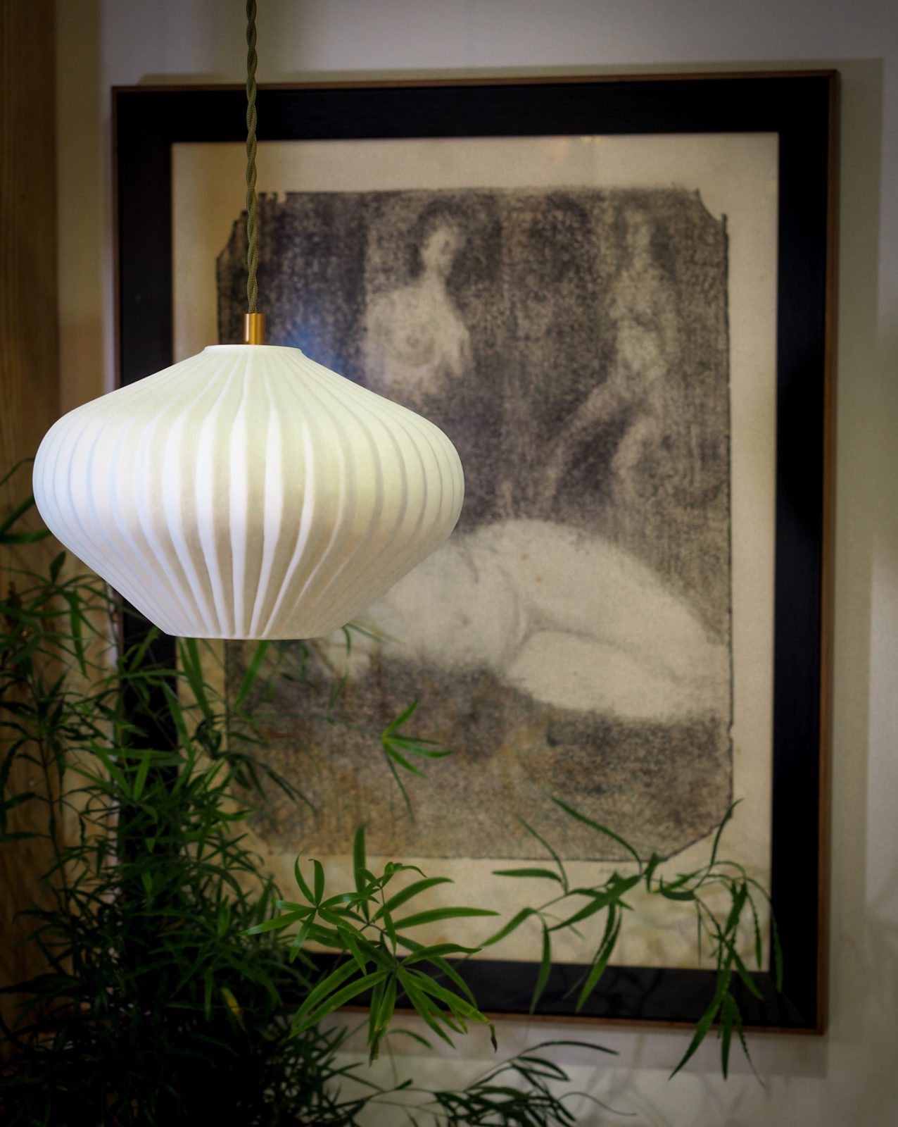 Above a dining table, in a living room or in a bedroom, her plays of light and refinement charm us tirelessly. Alone or in series of three, she is actually perfect in all circumstances. Berenice is available in enamelled porcelain or matte biscuit, as a pendant, floor lamp or lampshade alone.