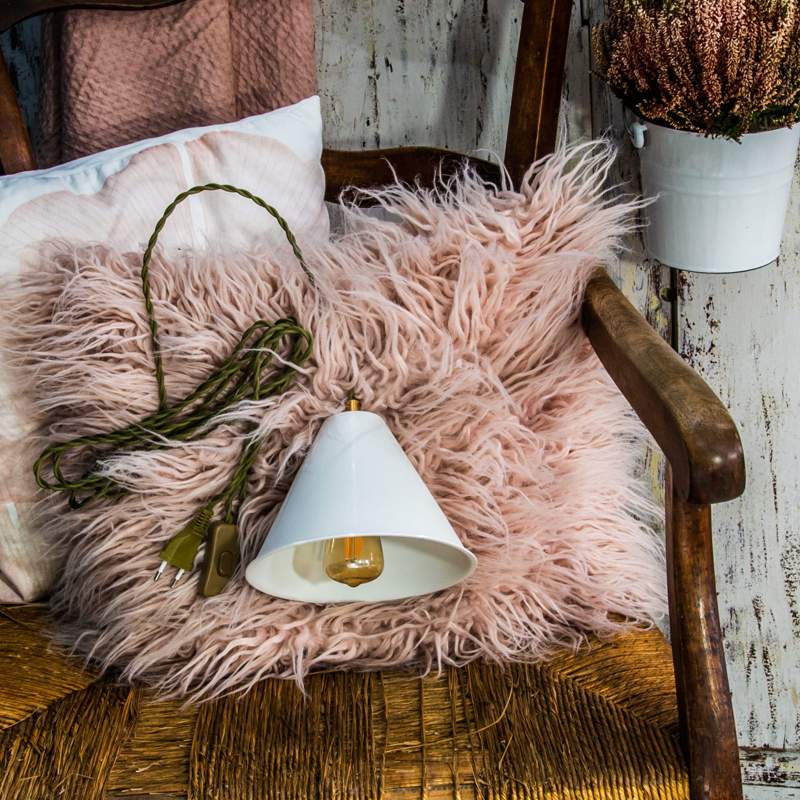 - Mounted with a 3m bronze braided electric cord, a bronze colored plug with 2 pins to EU standards, a bronze colored button switch and a white socket.